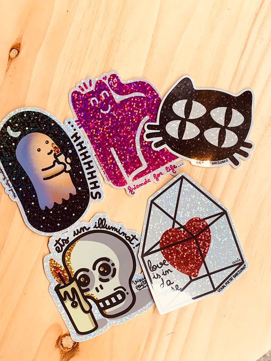 Pack de pegatinas de vinilo impresas en alta calidad con 5 diseños, fabricada en Barcelona. Ideal para customizar y darle un toque original a tus carpetas, casco de la moto, coche, nevera...allí donde mas te guste..