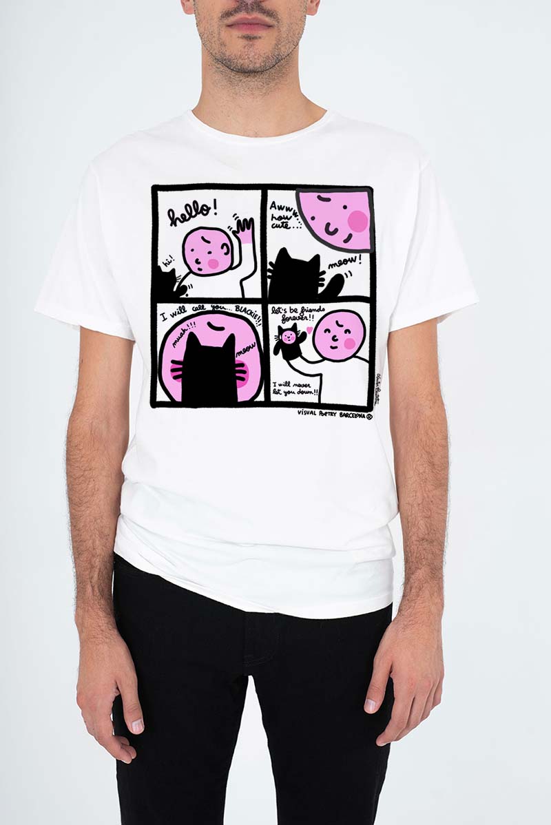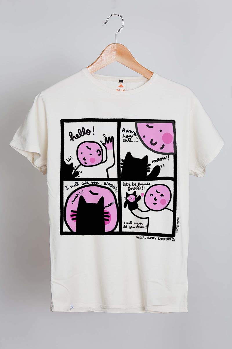 Camiseta de color blanco con poema visual Amigo imaginario. 100% algodón orgánico de tacto suave y agradable. Diseñada y producida en Barcelona