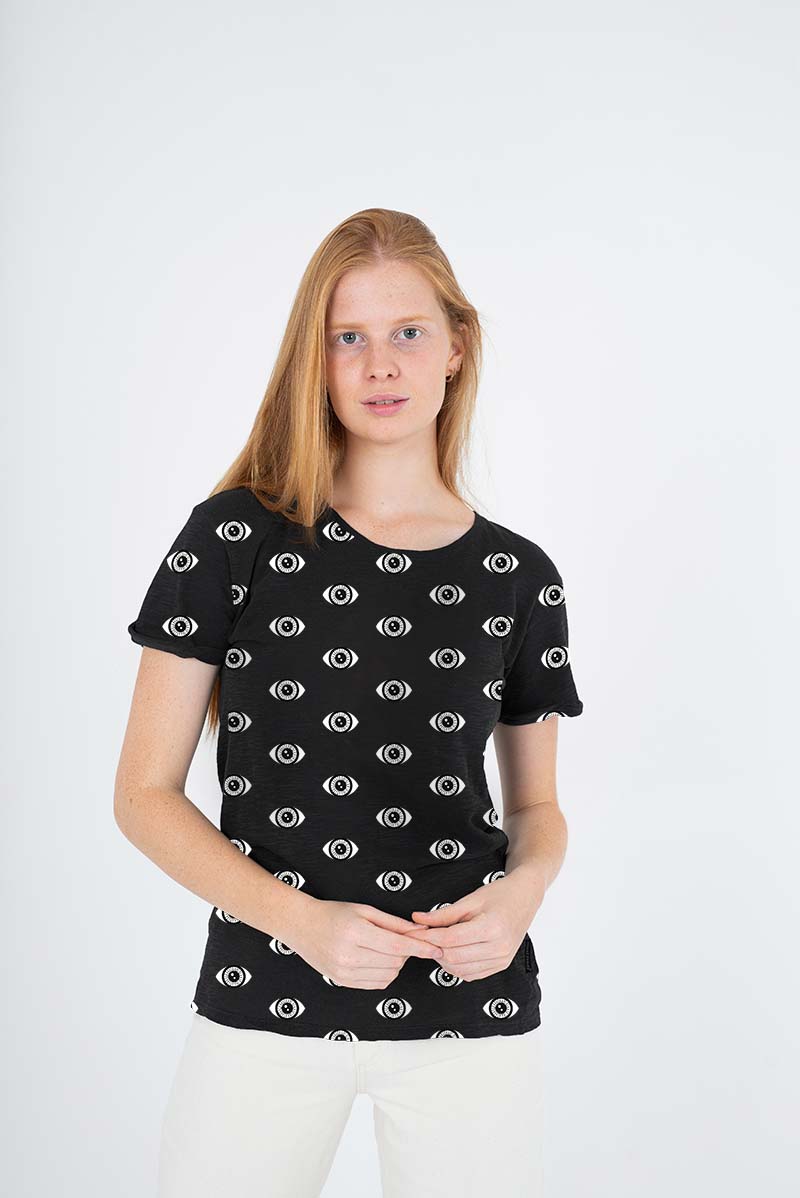 Camiseta mujer de color nergo con poema visual Eyes in the dark. 100% algodón orgánico de tacto suave y agradable. Diseñada y producida en Barcelona