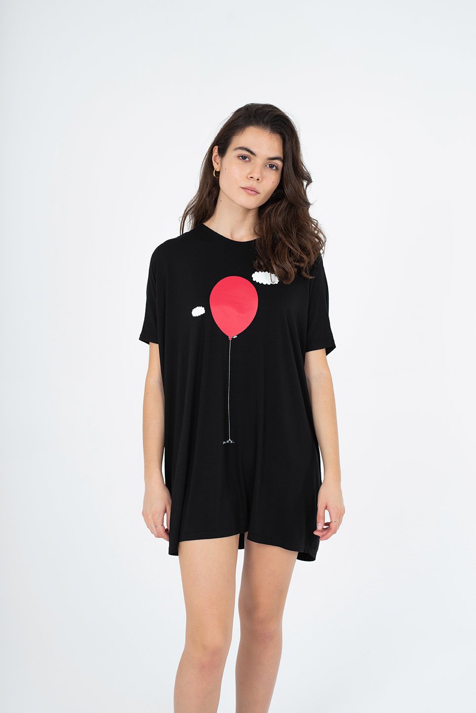 Vestido ancho de mujer de color negro, de viscosa con dibujo de globo. Diseñado y producido en Barcelona