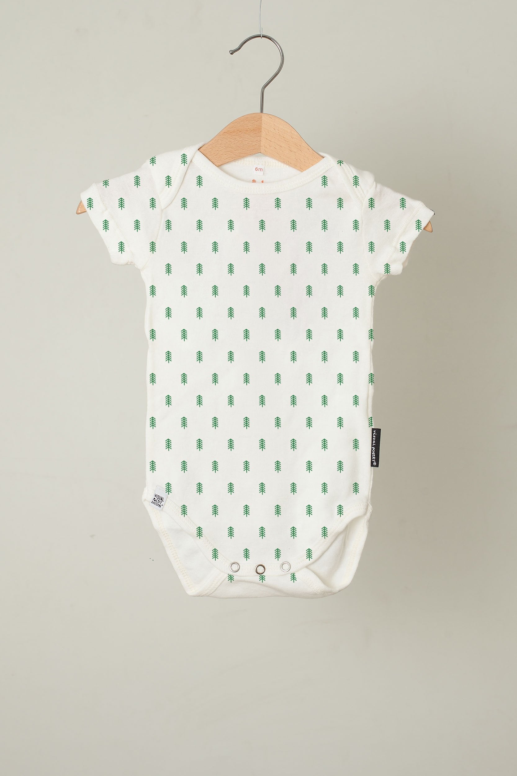 Bodi de bebé de 0 a 18 meses de color blanco con estampación de abetos. 100% algodón orgánico de tacto suave y agradable. Diseñada y producida en Barcelona