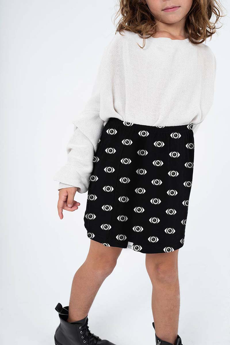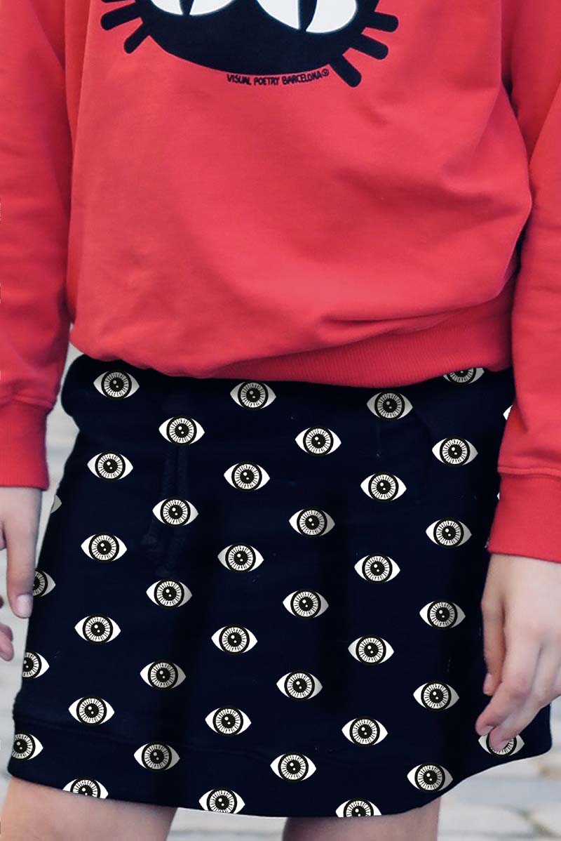 Falda niña viscosa de color nergo con poema visual Eyes in the dark. 100% viscosa de tacto suave y agradable. Diseñada y producida en Barcelona